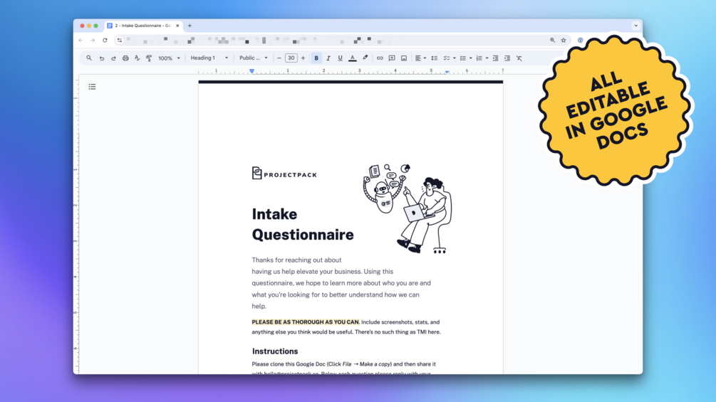 Please note: All the documents are available in Google Docs format (which I recommend using due to their text-heavy nature), but a small selection of them have been recreated in Figma and Client Portal.