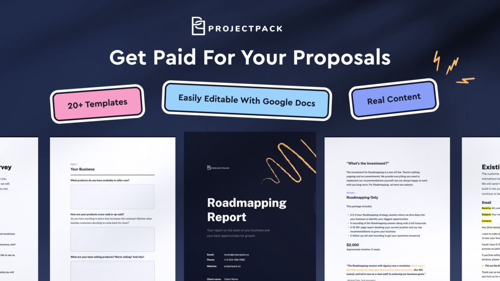 A killer proposal template for your consulting projects. This template was used on a recent project so we know it works. It’s not just pretty — it converts. Which is exactly what you need with a proposal. -